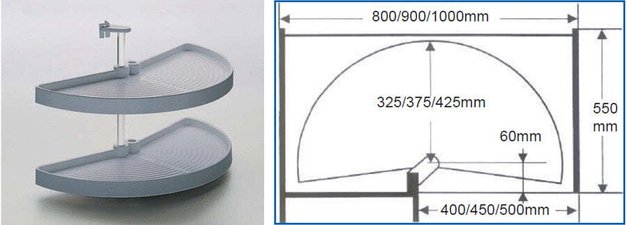 Halfronde zwenk plateau-set met 2 plateau’s en chromen draaibuis. Plateau’s voorzien van chromen reling en witte melamine antislip bodem. Belastbaarheid 20kg per plateau. Standaard met deur-meenemer voor het onderste plateau, waardoor deze automatisch bij het openen van de deur naar buiten komt. €465.- + verzend